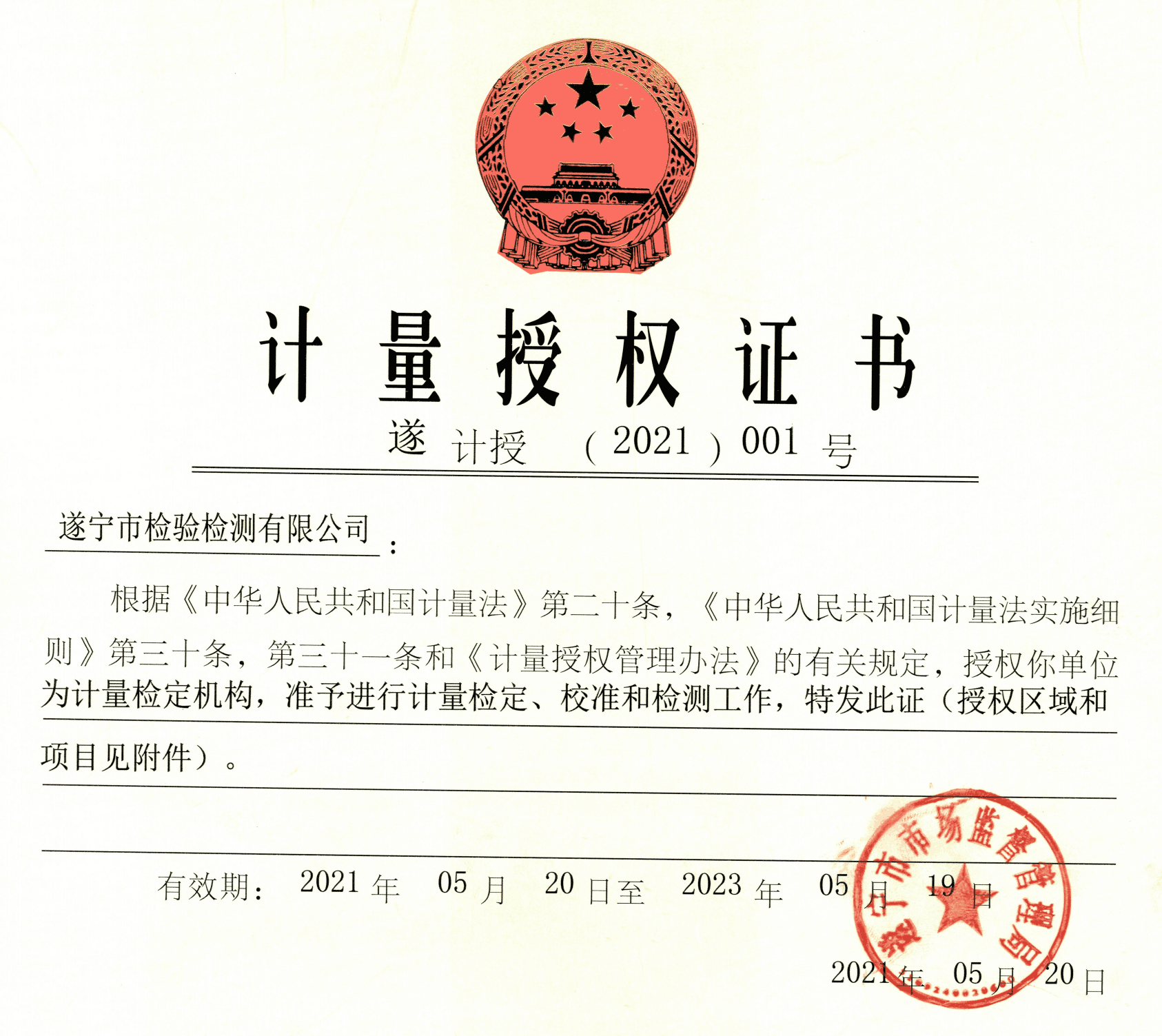 ? ? 近日,遂寧興業(yè)集團(tuán)直屬企業(yè)市檢驗(yàn)檢測公司計(jì)量檢測中心順利通過遂寧市市場監(jiān)督管理局計(jì)量建標(biāo)授權(quán)考核,成功取得“計(jì)量授權(quán)證書”。
